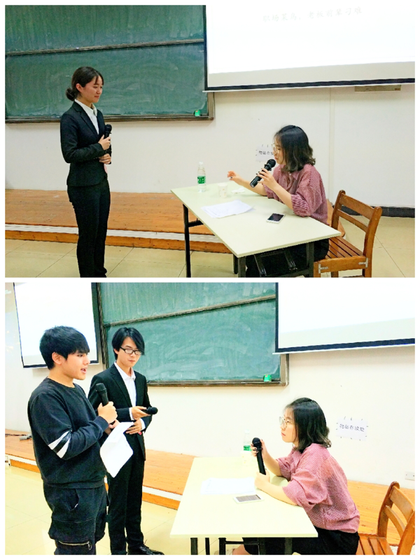 轻松的互动抽奖环节后,比赛进入了第二轮——主题演讲。该环节成功晋级的四位选手两两一组,通过观看视频和一分钟的思考后,围绕给出的主题进行即兴演讲,主题分别为“对新同事表示欢迎”“职场中议论他人”。在这一环节中,四位选手的演讲思路清晰,难分高下。激动人心的演讲环节后,评委对选手们的表现从多个方面进行点评,最终1号选手傅志倩、2号选手郭耘博晋级决赛。