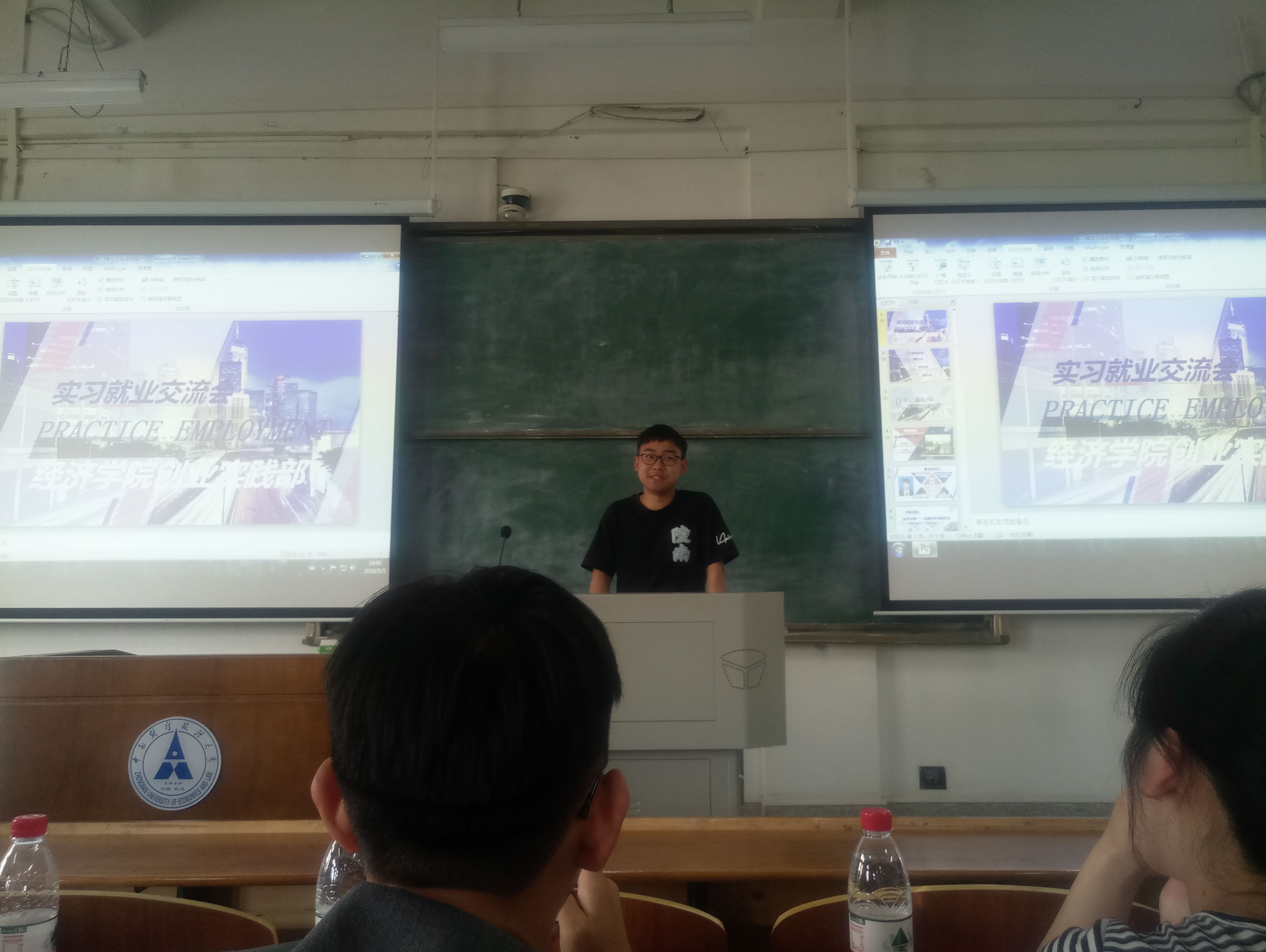 首先,主持人介绍了三位主讲同学大学期间的主要经历和所获奖项,让同学们对三位师兄师姐有一个初步的了解。接着,已经成功签约碧桂园公司的邓爽同学登上讲台,他给同学们展示了他大学期间的实习经历,告诉同学们有含金量的实习经历对成功就业的重要性。他详细的给同学们介绍了网上申请实习的流程并传授了无领导小组讨论和即兴演讲的技巧,鼓励同学们在大学过程中确定的未来就业方向,在实习时选择相应领域的岗位,为顺利进入心仪的领域打下良好的基础。