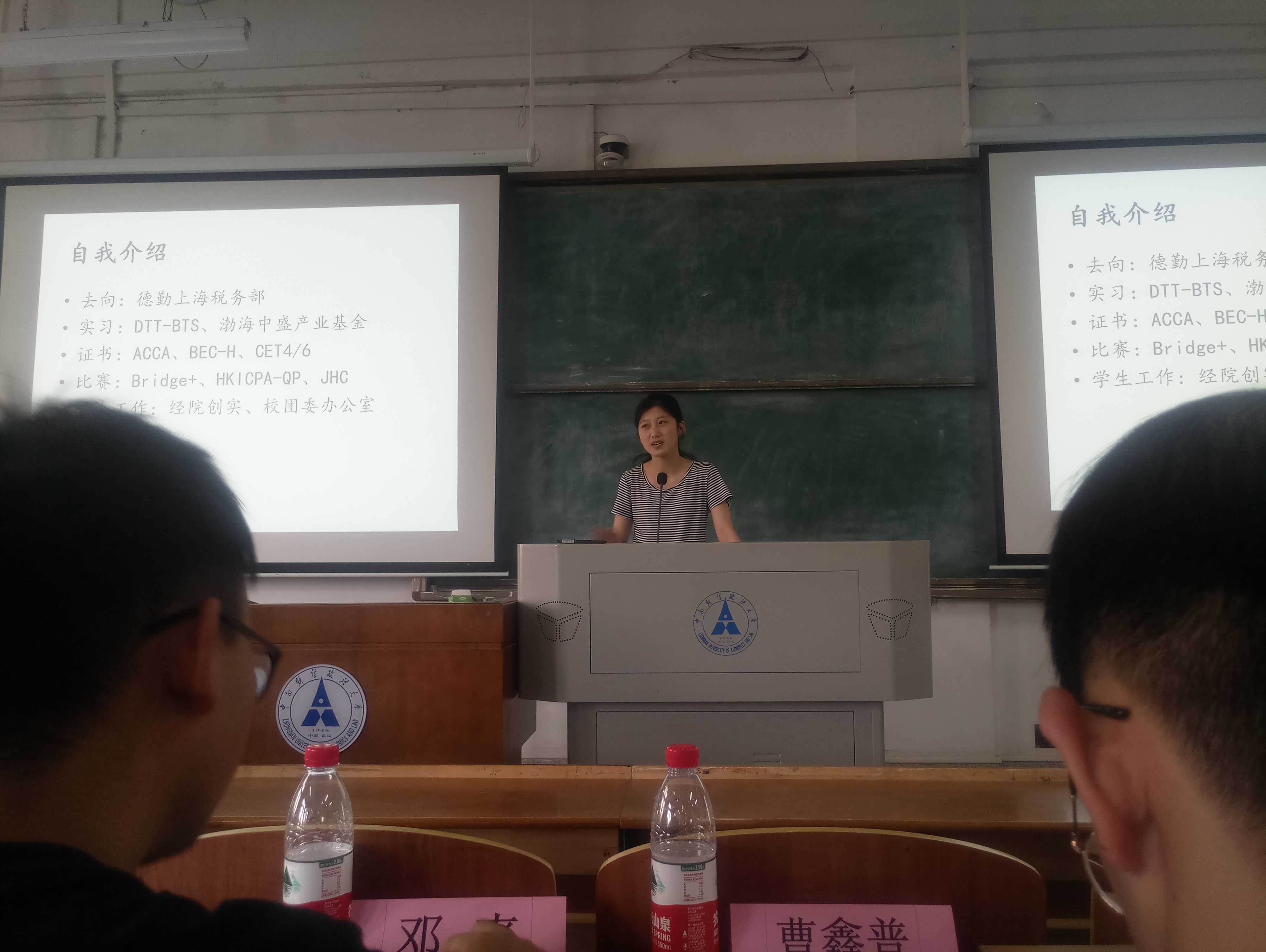 最后,签约德勤公司的周扬同学给同学们强调了目标的重要性,拥有清晰的目标是成功的第一步,一些有含金量的证书也能够为迈向成功添砖加瓦,因此同学们在确定好目标之后可以考虑从证书和实习经历入手,一点一滴的向目标迈进。与此同时,周扬同学给同学们介绍了简历制作技巧和求职信的撰写技巧,手把手的教同学们制作一份合格的简历和一封规范大气的求职信。