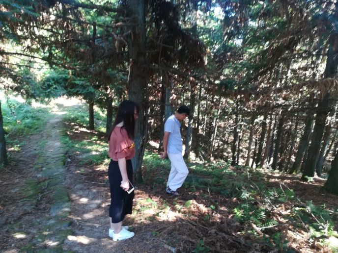 访谈结束后,村委会负责人邀请我们到黄龙山野生黄精生长基地一游,探索黄精生长秘密。山路曲折,天高云阔,愈上顶峰,气温逐渐寒凉。实践团队在负责人的带领下,步行至黄龙山顶野生黄精生长基地。放眼望去,密不透风的林地里,黄精遍地都是,长势喜人。团队成员有幸遇到了当地农民老乡,老乡向我们详细介绍了黄精的生长习性、生长周期和种植方法。