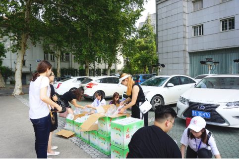 首先,由17级学生代表在老师的带领下,为18级新生分装梨子、月饼,并将分装好的慰问品运送到篮球场。尽管天公不作美,首义校区风起尘扬,但是这丝毫没有影响到老师与同学们的热情。