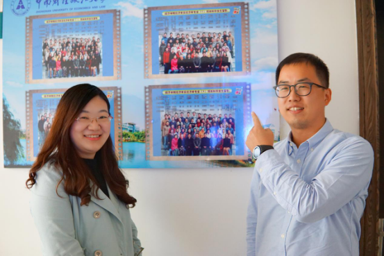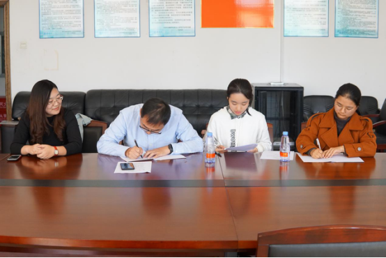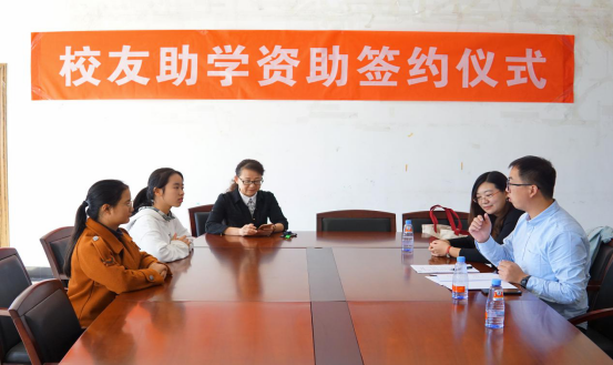 签约仪式开始之前,丁锡江先生与张婷女士两位校友一道在学院文化墙上找到了自己的相片,一时感慨颇多。随后,他们来到文泉楼207室与学院领导以及两位2018级本科生进行了深入的交谈。在签约之前,两位校友对受资助同学提出了一些要求与希望:希望她们的成绩可以保持较高水平,并且能够以积极向上的心态对待学习;在学习之余,也尽量多参加一些社会实践。
