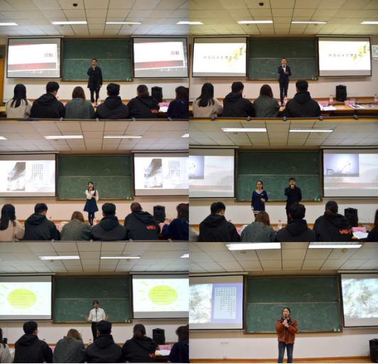 紧接着,到了更为紧张激烈的班级赛,各班级播放了在赛前精心制作的加油视频,将赛场气氛推向了一个小高潮。而后,比赛正式开始,国际商务1801班带来的原创诗歌《少年游》,情感充沛真挚,处处透漏着青春的气息;经济实验1801班的同学们带来的朱自清的《春》和林徽因的《你是人间的四月天》,展现了他们眼中四月花朵般美好灿烂、孕育无限希望的青春;而经济1802班对青春的理解又有不同,他们带领大家《迈着青春的脚步,走进21世纪》······