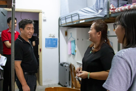 领导和老师们依次对女生宿舍、男生宿舍进行了走访,了解新生在报道与入住过程中的点点滴滴,耐心倾听新生与家长的对学校的感受与对大学生活的期盼与展望。首先,老师们在迎新志愿者的引导下来到女生新生宿舍,认真地向新生及家长询问报道中存在的问题,并对新生提出了自己的事情自己完成的要求,对于独自整理自己衣物的同学提出了表扬。在走访过程中,武身汉书记与詹万明副书记认真询问新生的生源地,在听到新生来自青海等距离武汉较远的地方时,认真嘱托同学们要尽快适应武汉湿热的气候、适应远离家乡的大学生,同时向回族同学推荐了学校的清真食堂,并来自武汉的新生提出,要尽快帮助同学适应在武汉的生活。同时,对于新生家长们提出的建议,表示会尽快向学校反映,使家长们对同学们的人身安全放心。