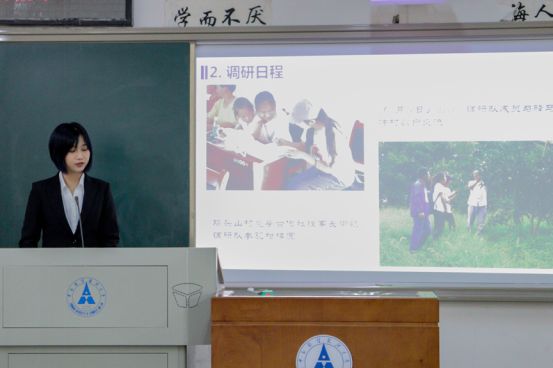 活动伊始,由林海琳同学对本次活动的背景、目的、意义及流程进行简要介绍。随后,两个教室分别依次进行答辩活动。各实践团队依次上台对于本组调研成果进行PPT展示、宣传视频播放,并辅以讲解,在短暂的讲解过程中,各个团队大展风采,答辩人准备充分、思路清晰,细致完整地向评委进行展示,并接受了评委的提问。