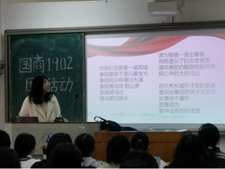 在第二天的团日活动中,由团支书陈晓琪同学在文泽207教室开展了有关党史国情的介绍会,进行相关知识介绍。介绍会分为三部分,首先是邀请在场同学进行心目中爱国人士的分享,而后开展了红色基因的知识竞答活动,最后共同赏析了席慕容先生的作品《出塞曲》。