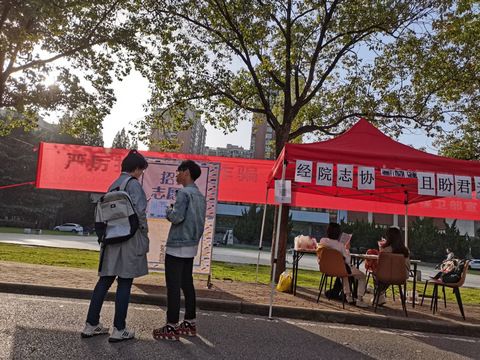 (图2:经院志协的干事向路过的同学进行宣传)
