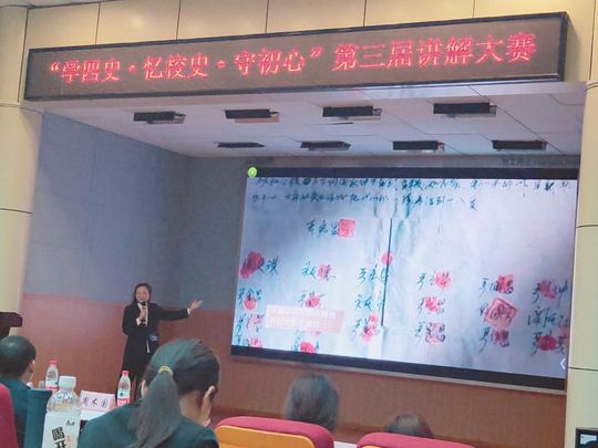 本次决赛共分两轮,第一轮抽签决定讲解主题,参赛选手以校史、“四史”为主题进行讲解,展示时间为8分钟。十位专家评委就参赛选手的讲解情况进行评分,去掉最高分最低分后,得分前六名选手进入决赛第二轮。第二轮现场抽取关键词题目进行3分钟即兴演讲,最终得出一二三等奖。