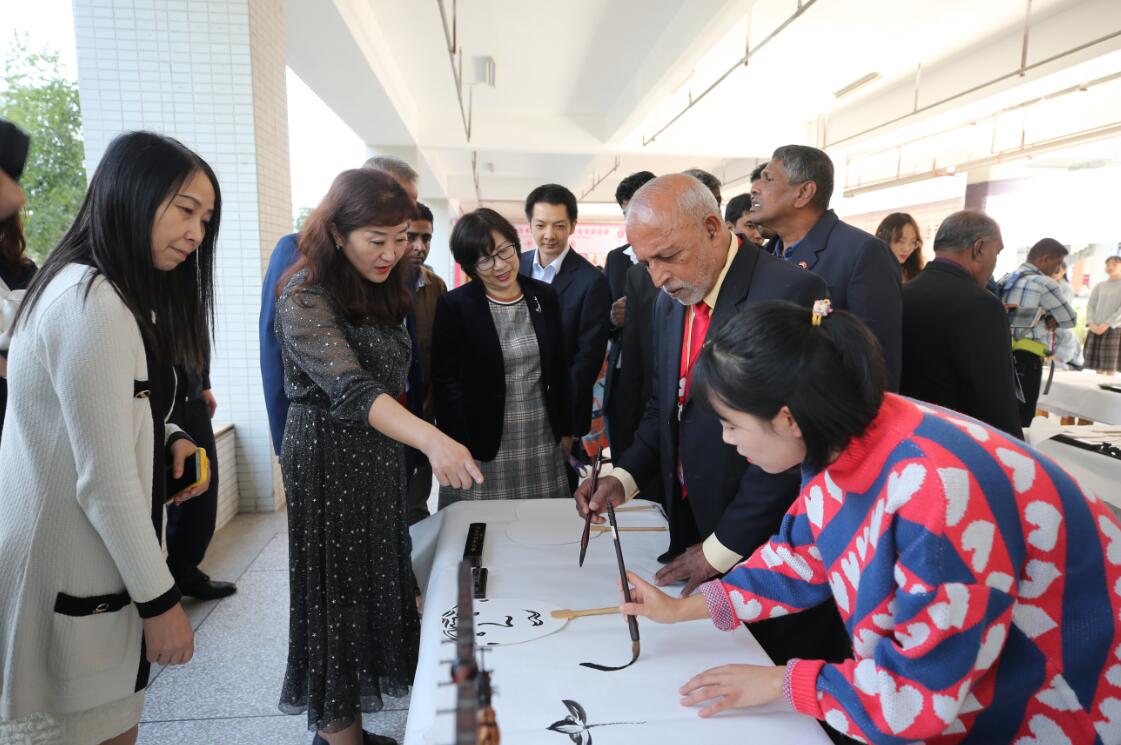 Indrananda Abeysekara, President of Sri Lanka-China Social and Cultural Cooperation Association, and his delegation highly praised the intangible cultural heritage works of Chinese calligraphy and painting, paper-cutting and black sand pottery displayed by our institute and communicated cordially with teachers and students. The delegation also showed the teachers and students the traditional crafts and culture such as wood carving products, traditional costumes and puppet shows. A piece of dead wood is turned into magic in the hands of the producer, and the vivid shapes make teachers and students enjoy a visual feast.