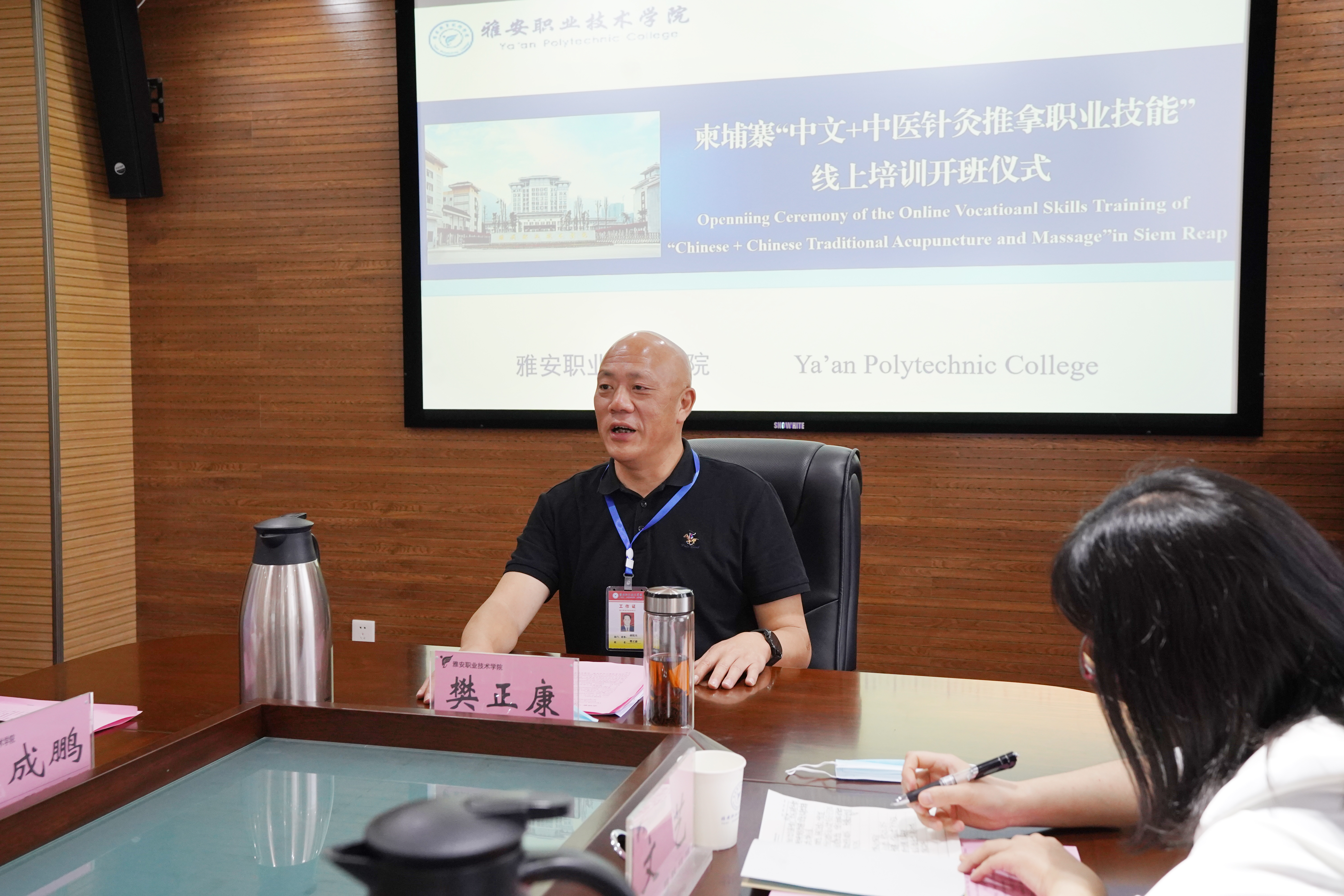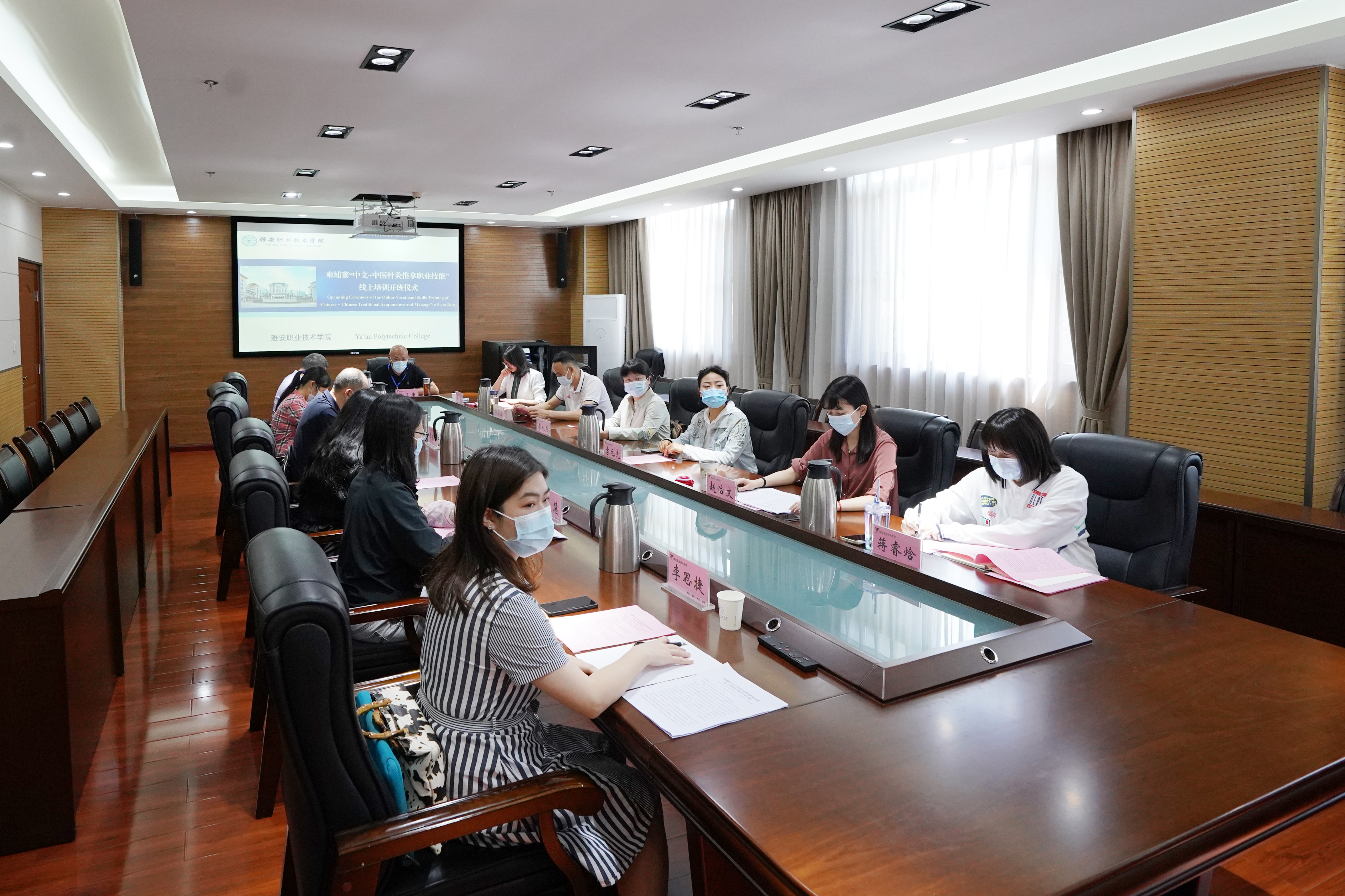 On April 26, the college held the opening ceremony of the Cambodian online training course "Chinese + Traditional Chinese Medicine Acupuncture and Tuina Vocational Skills" in Conference Room 303 of the Administration Building of the Economic Development Campus. Liu Zhijie, Counselor of the Chinese Embassy in Cambodia and Director of the Office of the Consulate in Siem Reap, Fan Zhengkang, Member of the Party Committee and Vice President of the College, Lin Xing, Consuls of the Chinese Embassy in Cambodia, Vice President of Siem Reap Provincial Hospital, College of Traditional Chinese Medicine and Rehabilitation, The relevant person in charge of the Continuing Education and International Exchange Office and the teaching team attended the opening ceremony.