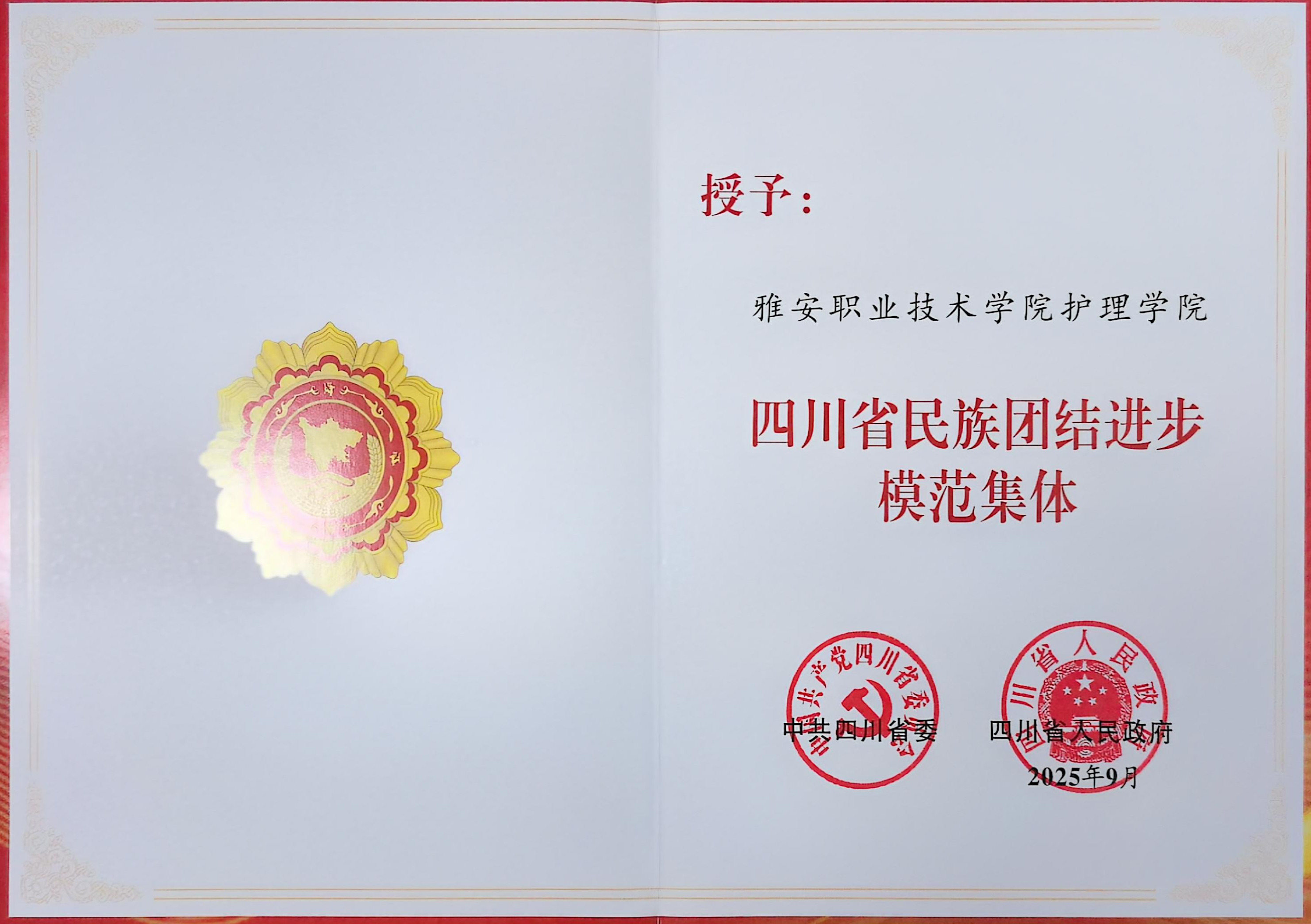 09-30-2025喜报!鸭脖护理学院荣获“四川省民族团结进步模范集体”称号