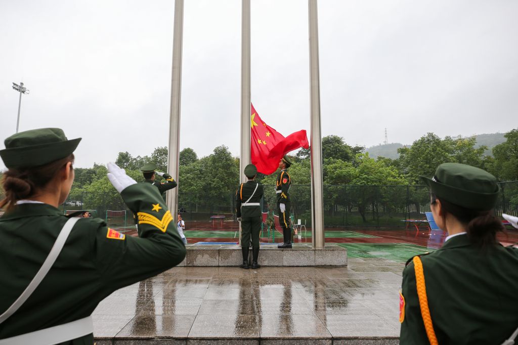 授旗仪式上,李春模与黄诚分别将军训团旗授予两校区总教官,并宣布军训正式启动。