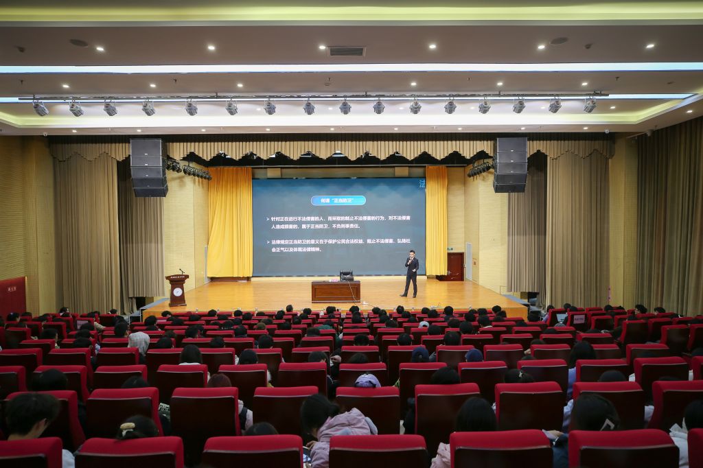 王梓作了《法护青春 扬帆远航---大学生法治思维的养成和运用》主题讲座,他从热点事件中法治思维切入,告诉同学们要善于运用法律武器,不造谣,不传谣,不信谣;在大学生常见法律风险的应对与化解部分,他从“帮信”罪谈起,结合真实案例教育大家规避就业风险,在求职中避开“雷区”;针对法治思维的内涵、价值与养成,他用案例告诉同学们要学法用法、善用法治思维解决问题。