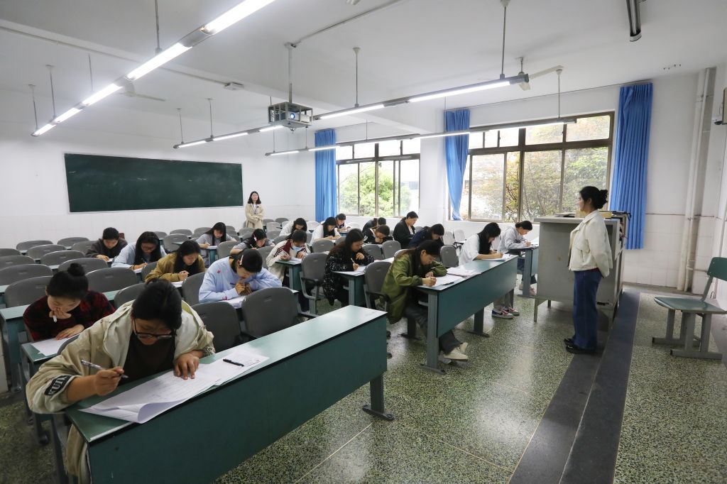 考试包含文化知识综合笔试和技能测试两个环节。当天上午,考生们早早到达学校,在志愿者的引导下,从容有序进入文化知识综合笔试考场。下午,技能测试在青年路校区教学楼B栋进行。