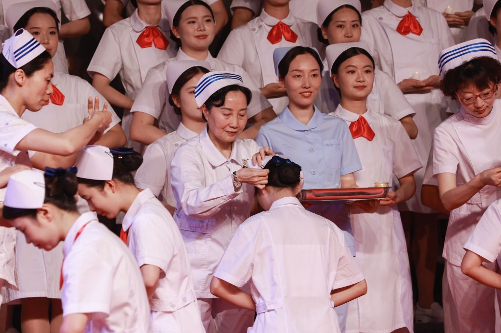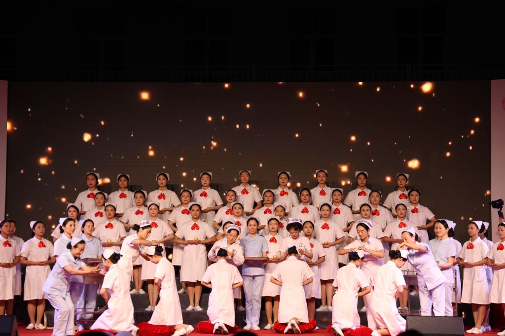 传光授帽仪式将整个活动推向高潮。黄丽琼、王青力、王成英、许玉贤、王静、陈俊六位护理领域的优秀前辈为学生代表郑重地戴上象征着护理职业荣誉与责任的燕尾帽,寓意着生命之光的烛蜡在前辈们手中依次点亮,传递着护理精神的火种。学生们庄重地举起右手宣誓,热爱护理事业,遵守护士的职业道德,一切以患者为中心,永葆白衣天使的圣洁。伴随着全场齐声合唱《让世界充满爱》,晚会在温馨、优美的旋律与温暖感人的氛围中圆满落下帷幕。