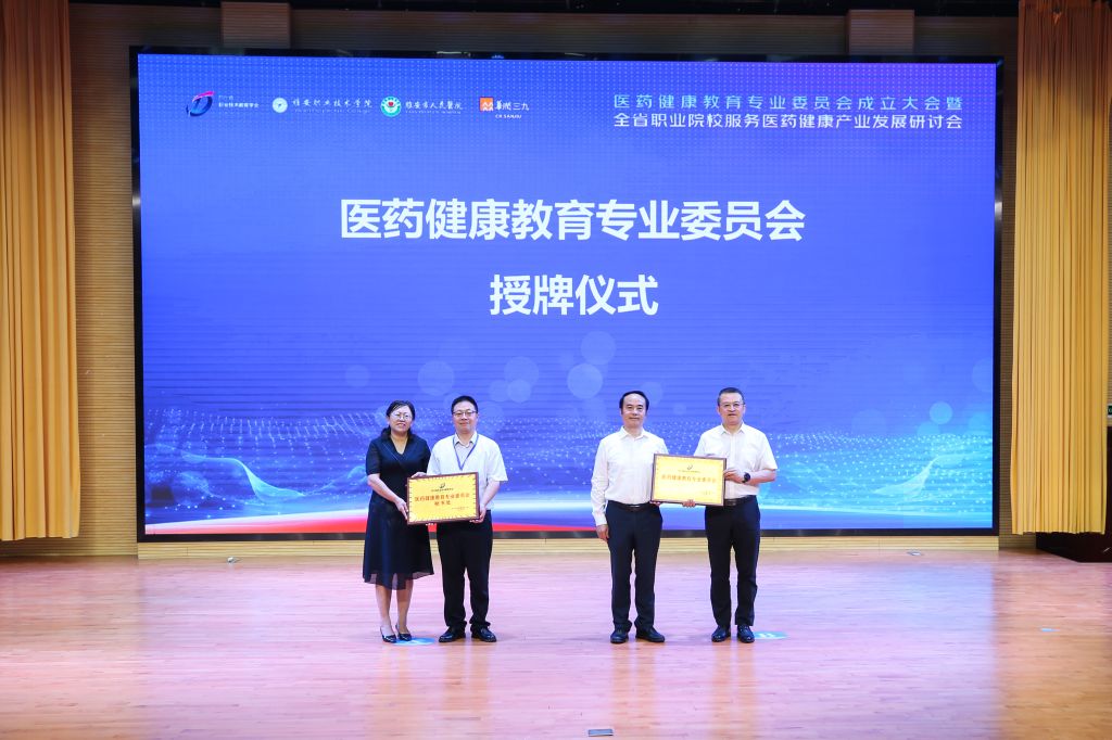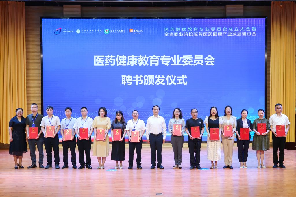 省职教学会秘书长姜光丽宣读医药健康教育专业委员会组织机构及成员名单,与张大凯一起为全体成员单位颁发聘书。张大凯单独向鸭脖校长黄诚、教务处长李成忠授予主任单位和秘书长单位牌匾。