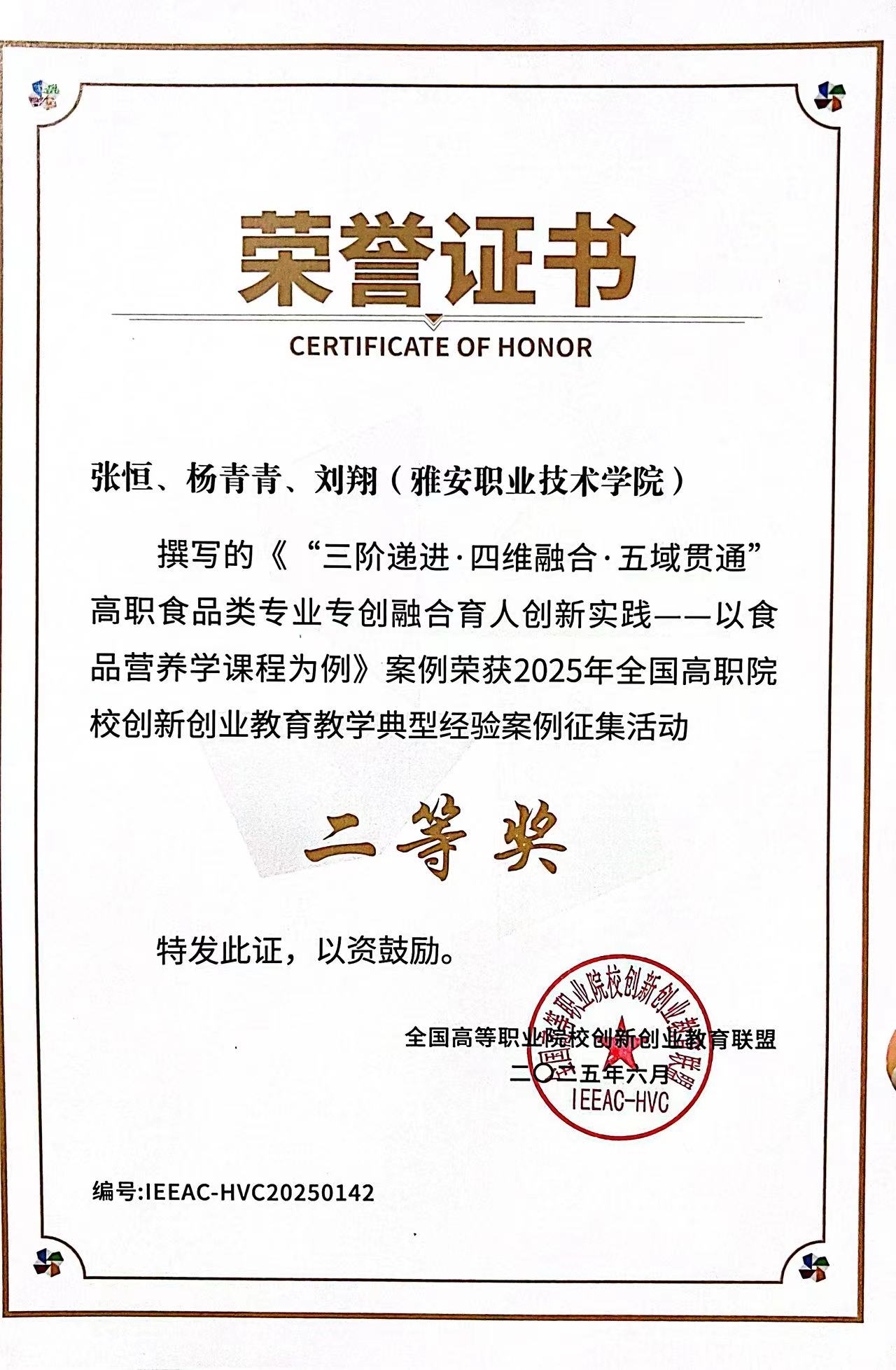 近日,全国高等职业院校创新创业教育联盟公布了2025年全国高职院校创新创业教育教学典型经验案例评选结果,鸭脖《“三阶递进·四维融合·五域贯通”高职食品类专业专创融合育人创新实践——以食品营养学课程为例》荣获二等奖。
