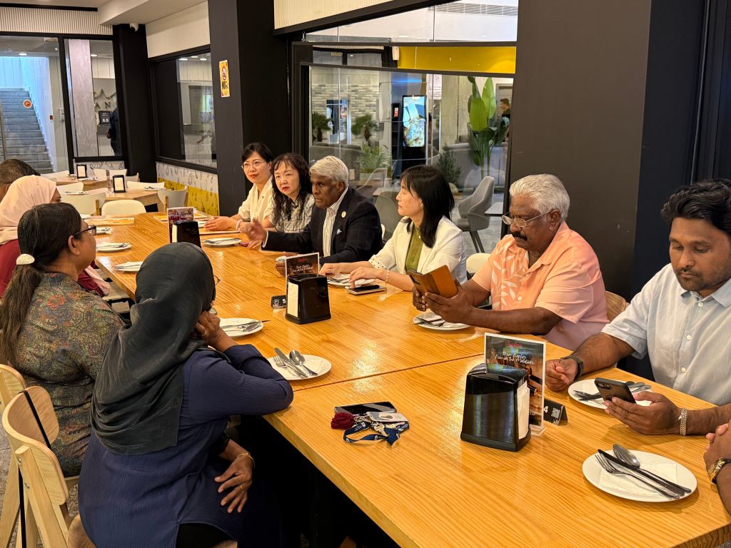 访问期间,代表团首站与中国-马尔代夫文化交流协会主席莫瑞德在马尔代夫维拉学院汉语中心座谈。双方肯定学校此前在国际生培养、中医药文化和茶文化海外传播中的成效。莫瑞德先生首先感谢学校近三年来招收和培养了16名马尔代夫留学生,并指出随着中马经贸往来日益密切,中文教育需求日益增长,希望与鸭脖进一步加强交流合作,常态化开展互访交流活动,促进本土中文教师培训和学生中文培训。