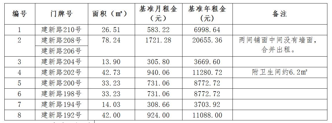 本次出租商铺位于雅安市雨城区建新路,共8个铺面。此次出租商铺不得用于经营餐馆、烧烤、网吧、游戏厅、酒吧等影响周边住户正常生活的项目。现按标底价进行竞标,明细如下: