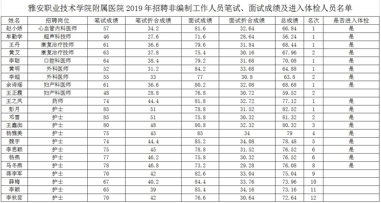 YABO鸭脖官网附属医院2019年招聘非编制工作人员笔试、面试已经结束,根据《2019年招聘非编制工作人员公告》规定,现将考生笔试、面试成绩、排名情况及进入体检人员名单予以公告。