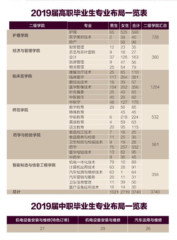 学院设有临床医学院、护理学院、药学与检验学院、师范学院、经济与管理学院、智能制造与信息工程学院、思想政治理论课教学部、基础医学院及一所综合性二级甲等附属医院,开设高职高专专业51个。是经教育部批准具有临床医学类和教育类专业招生资格的高职院校,其中,医学影像技术专业和学前教育专业是中央财政支持的特色引领性专业,护理专业被列为国家紧缺技能型人才培养项目。同时,医学影像技术、护理和药学三个专业为省级重点专业。