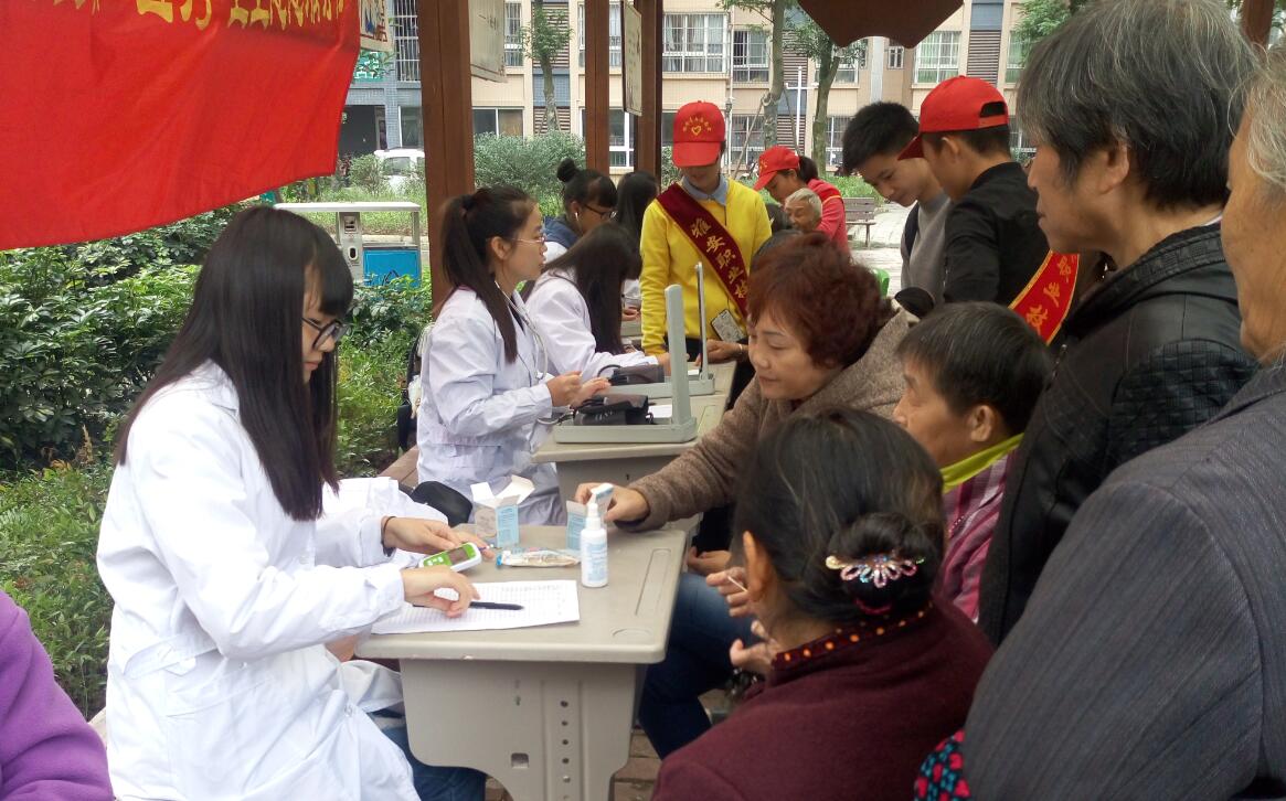 【本网讯】为了增强居民的健康保护意识,提高居民健康知识水平,让居民能够在自家门前享受到免费的医疗服务,医学系“绿丝带”医疗卫生志愿服务队于10月29日上午在土桥村社区设立服务点开展义诊活动。
