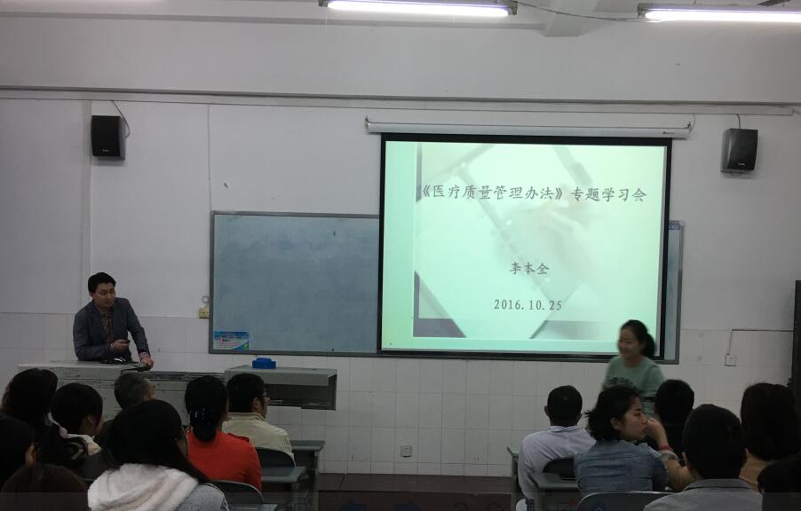 【本网讯】为进一步推进医疗质量与安全工作,切实贯彻落实11月1日起实施的国家卫计委颁布的《医院质量管理办法》, 10月25日下午,附属医院在育才路校区101多媒体教室召开了全院医疗质量与安全培训大会,全院医、技、护人员除值班留守人员外全部参加此次培训。