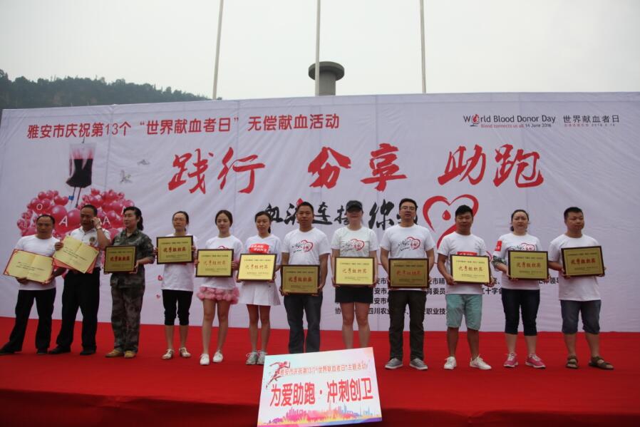 【本网讯】6月14日是世界第13个献血者日。当日上午9点,雅安市精神文明办、雅安市献血工作领导小组、雅安市卫计委和红十字会联合在雅安市体育馆举行了2016年“世界献血者日”主题宣传活动,附属医院共有20名党员代表和志愿者代表参加了该主题宣传活动中的“感恩重建•为爱助跑” 无偿献血公益长跑活动,以实际行动践行“两学一做”学习教育。