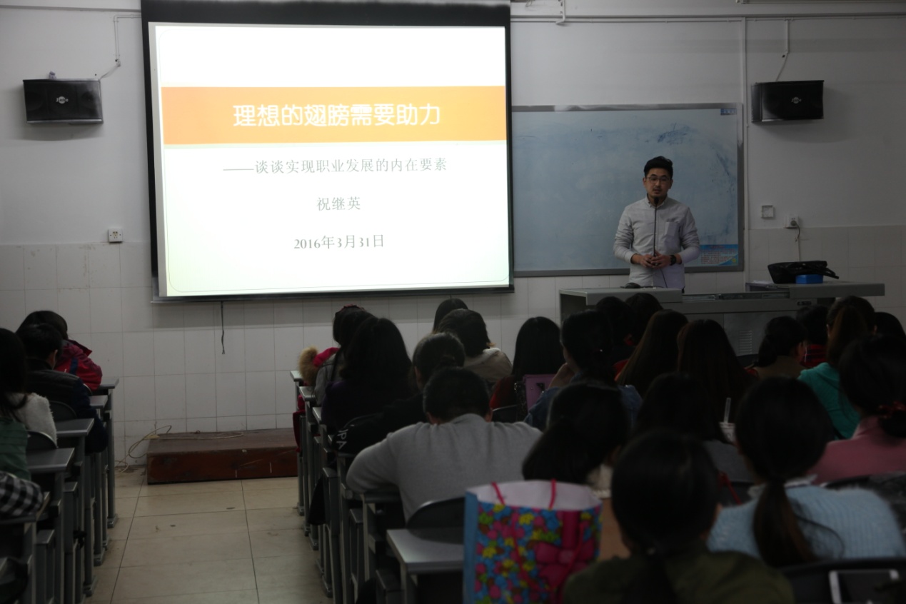 【本网讯】3月31日晚,在育才路校区实509教室,附属医院党支部书记祝继英为本院120多位青年职工作了题为《理想的翅膀需要助力——谈谈实现职业发展的内在要素》的讲座,开启了青年讲坛2016年第一讲。讲座由中医骨伤康复科杨杰医生主持。