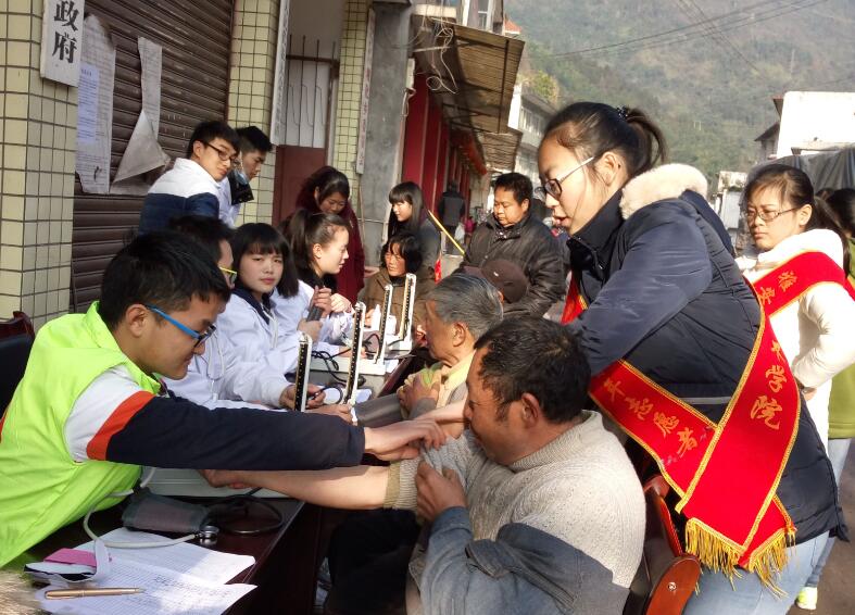 清晨,伴着赶集的人潮,医学系志愿者们早早来到观化乡乡政府设立服务点,利用所学的专业知识为乡民们测量血压和血糖,并为他们讲解冬季保健常识和健康生活小技巧,发放疾病预防宣传资料200份。