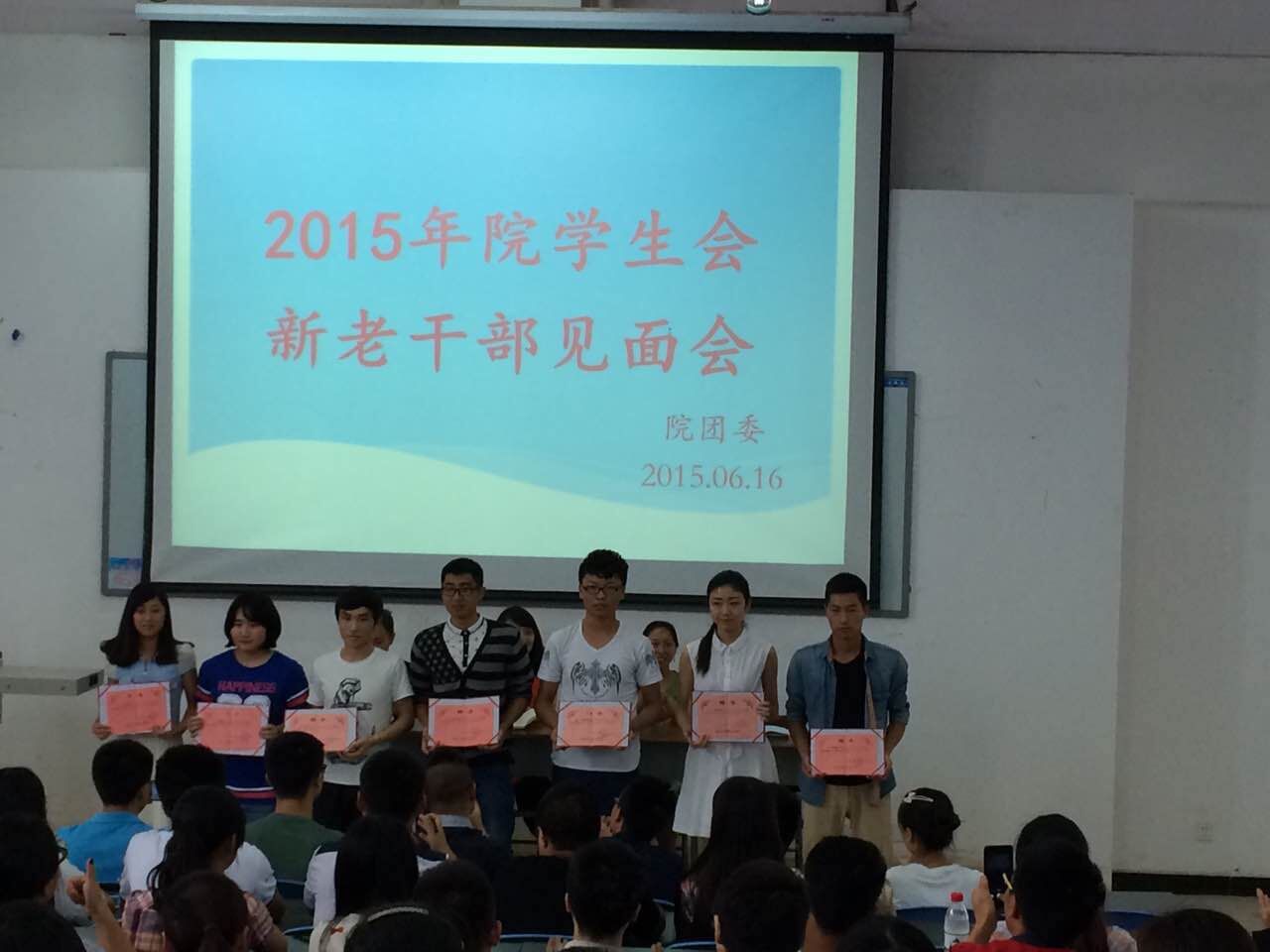 【本网讯】为加强学生会新老干部间的交流与协作,促使学生会干部更好的明确职责,开展工作,6月16日下午,院团委在图书综合楼阶梯102教室组织召开2015年院学生会新老干部见面会。院团委书记高运荣及团委老师,学生会全体干部参加了见面会。会议由新一届院学生会主席团成员耿涛主持。