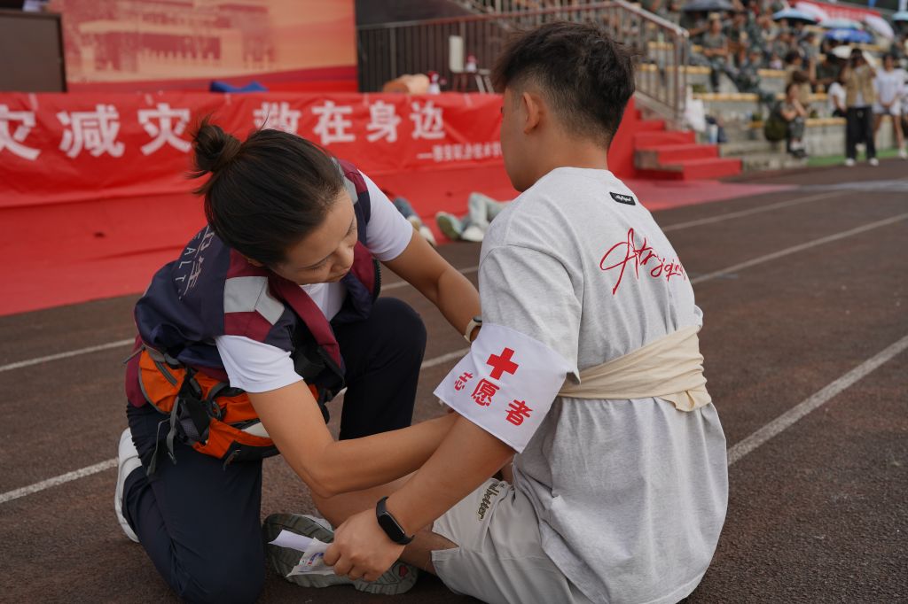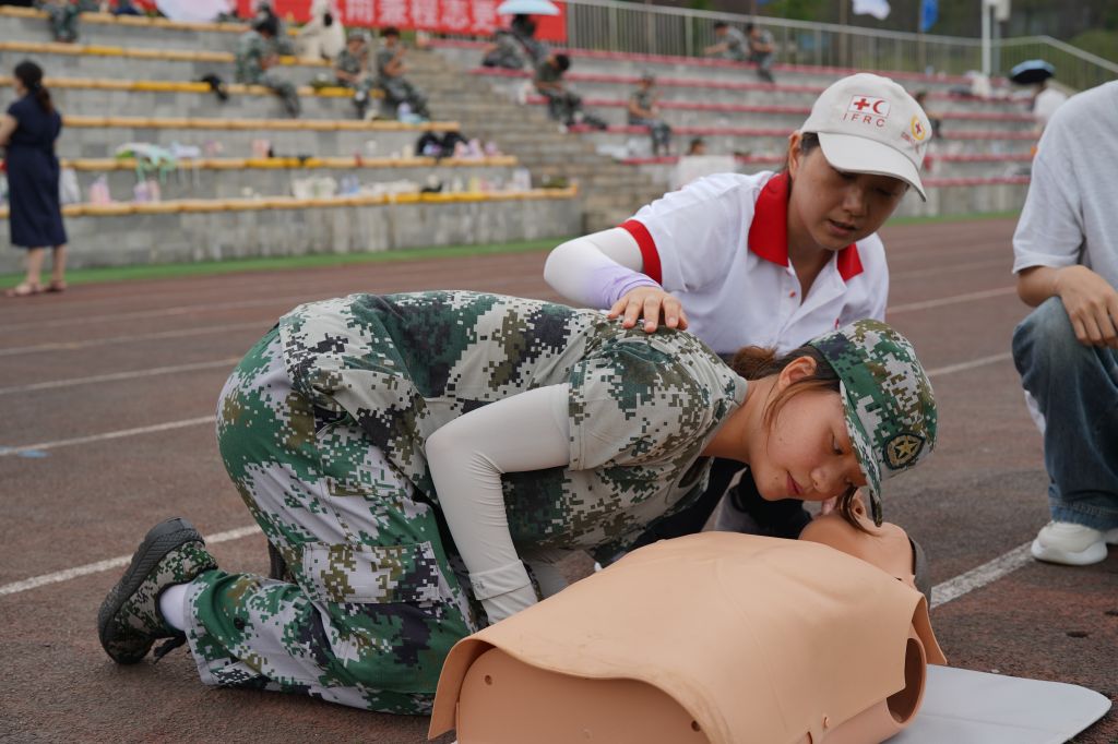 在绿草如茵、生机勃勃的操场上,一群身着迷彩服的青春学子正忙碌地投身一场特殊的“战斗”。他们正在掌握一项关乎生命安危的宝贵技能——急救!9月18日-19日,学校邀请雅安市紧急救援中心、中国人民解放军后勤保障第九四五医院、雅安市红十字会的专家团队与校内专家一起,在学校青年路校区、经开区校区操场为全校6000余名2024级新生上了军训中的宝贵一课。学校党委常委、副校长陈冬冬出席本次活动。