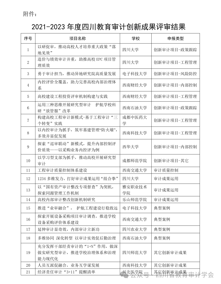 11月19日,四川省教育审计学会在都江堰召开了2021-2023年度四川省教育审计创新成果评审会,确定了创新审计成果。学校审计处的《以‘国有资产审计整改专项督查’为契机,探索同源管理工作机制》项目,荣获审计成果运用类别的创新奖,成为唯一一所获四川省教育审计创新成果奖的高职院校。