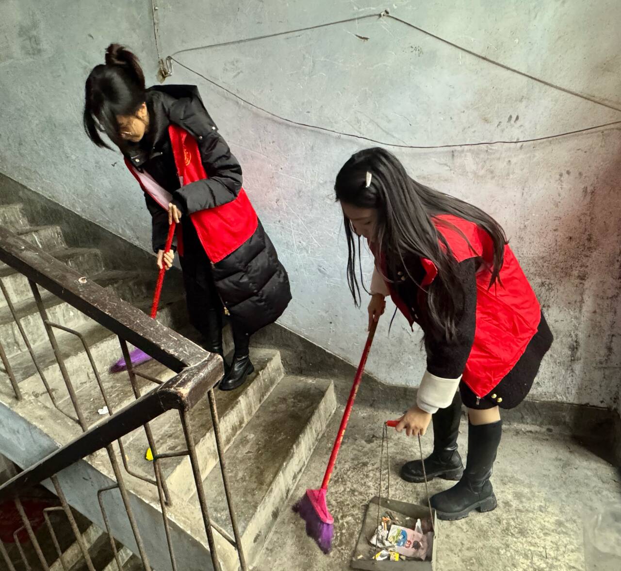 蒙蒙春雨之下,志愿者身着红马甲,手持清洁工具,根据社区卫生需要,按小组进行合理分工。志愿者们仔细清扫楼道走廊的灰尘、烟头等垃圾;对小区垃圾进行分类整理,确保环境干净整洁;帮助老年人学习智能手机的使用,耐心解答各种问题,忠诚践行“奉献、友爱、互助、进步”的志愿服务精神,受到社区居民的一致好评。