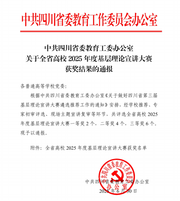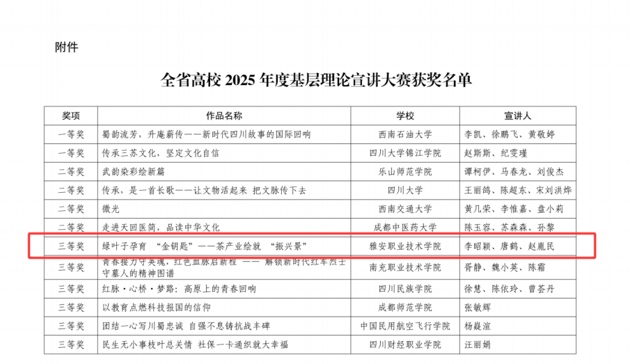 近日,四川省教育厅对全省高校2025年度基层理论宣讲大赛获奖结果进行通报,本次比赛共评出一等奖2个,二等奖4个,三等奖6个。鸭脖马克思主义学院教师李昭颖老师主讲的宣讲作品《绿叶子孕育“金钥匙”——茶产业绘就“振兴景”》获得三等奖。