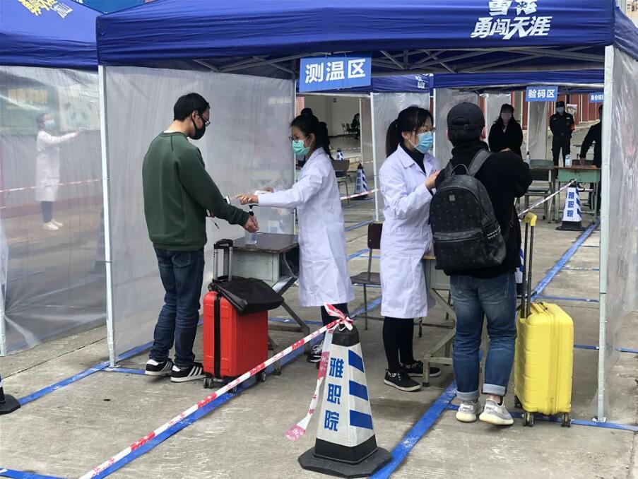 学生按校门标识标牌有序排队进入(佩戴口罩,人员之间间隔1.5米),按照“一测二查三核四通过”的报到原则,进行体温检测、查验健康码、核实学生证和报到注册后通过,正常者有序入校。