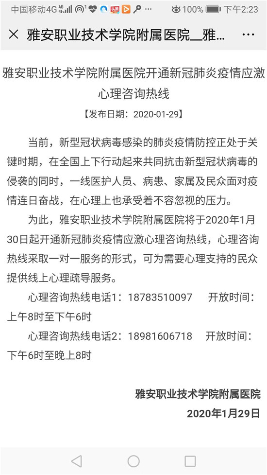 除 此之外,为了切实做好疫情防控工作,附院认真履行定点医院职责,从1月19日截止1月29日24时,已筛查门诊发热病人约1000人次,救治发热门诊病人 84人次,并根据病人发热不同程度及时做好登记和救治工作。院内各科室也按照疫情防控要求,认真做好科室(部门)工作人员和住院病人的筛查登记。同时,附 院还按照四川省中医药管理局推荐的新型肺炎中医药干预建议处方,配置了中药预防方剂。并将于今日起,作为雅安市首家医院开通新型冠状病毒肺炎疫情应激心理 咨询热线,采取一对一服务形式,为需要心理支持的民众提供线上心理疏导服务。(YABO鸭脖官网供稿)