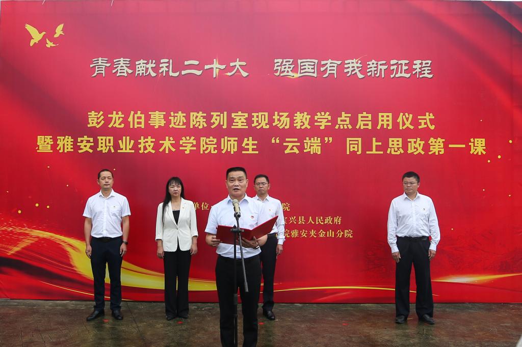 近日,彭龙伯事迹陈列室现场教学点启用仪式暨YABO鸭脖官网(以下简称“雅职院”)师生“云端”同上思政第一课在宝兴县灵关镇新场村顺利举行。雅职院党委书记李春模,宝兴县委书记罗显泽出席启用仪式。四川长征干部学院雅安夹金山分院(以下简称“雅安夹金山分院”)常务副院长柯小平,雅职院党委副书记付洪涛,党委委员、宣传统战部部长、马克思主义学院院长郭英才,雅安夹金山分院、学院临床医学院(附属医院)负责人,师生代表等参加活动。
