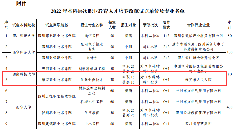 2022年,学院与西南科技大学、西南医科大学及雅安市人民医院合作,成功获批联合培养医学影像技术专业、护理学专业本科生,实现了学院医学类本科人才培养的夙愿。以此次本科层次联合培养为契机,积极探索高层次医学技术技能人才培养模式与创新“中高本”职业贯通教育模式,努力打造医学人才培养高地,不断提升服务区域医疗卫生事业创新发展的能力。