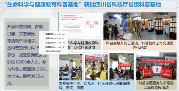 2019年,我院“生命科学与健康教育科普基地”获批四川省科技厅省级科普基地,和四川省社会科学联合会哲学社会科学科普基地。学院将进一步创新科普工作方式,提升科普服务质量,为地方社会健康和谐发展做出积极的贡献。