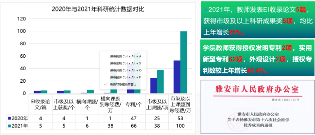 10年间,学院科研从零起步跨越式发展,年度科研经费达800万,累计科研经费总量达到6千万元,省市级科研项目达到365个,省级科普基地2个,院士(专家)工作站1个。科研实力在四川西部同类院校中居于领先。